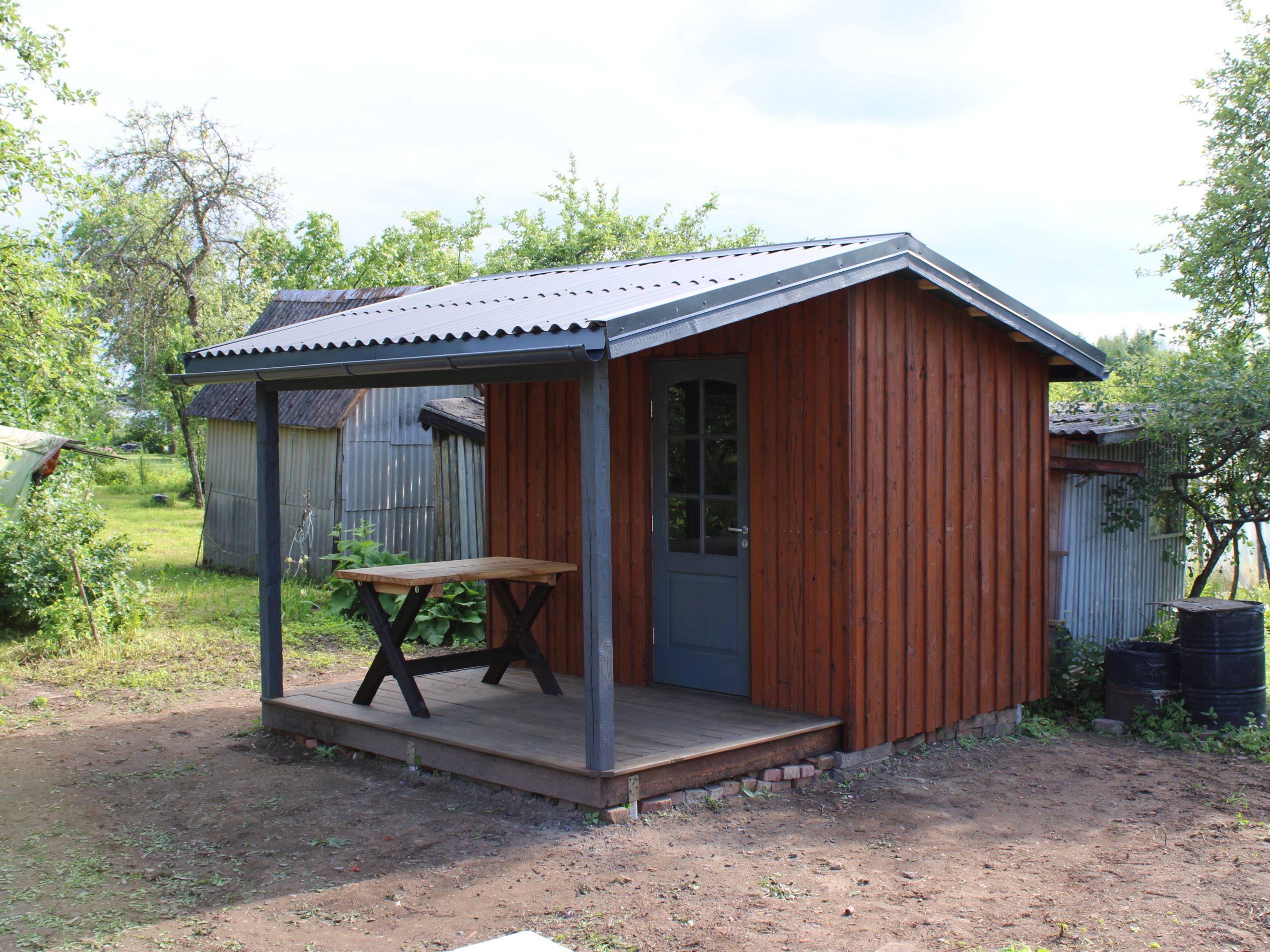 Dārza mājiņa RW-12 ar dedzinātu apdari un terasi – nojumi